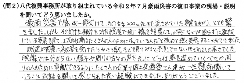 建設業の方々は復興に向けて頑張っておられます。生徒達には、将来、土木技術者として活躍できる人材となって、1日でも早く、復興が進み、安心・安全に暮らせる熊本に戻ってほしいと願います。