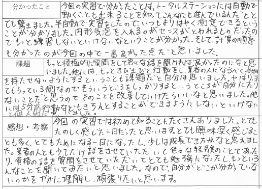 技術者の方々より丁寧に教えていただき、土木工事や各種測量の基準となる基準点に関する技術を身に付けることができました。