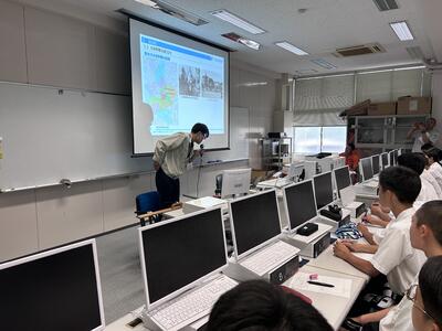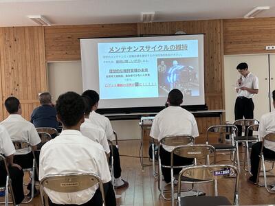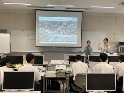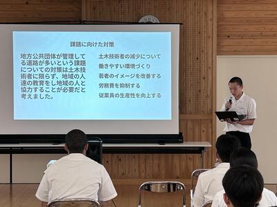 午前中は熊本市上下水道局の西原様(土木科OB)と熊本県管工事協同組合連合会の永田様に講話をいただき、熊本地震・能登地震に対しての対応や今年度2年生課題研究のテーマである「維持管理」に関して講話をしていただきました。