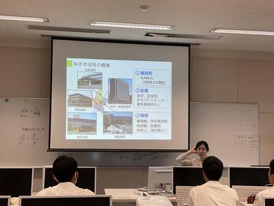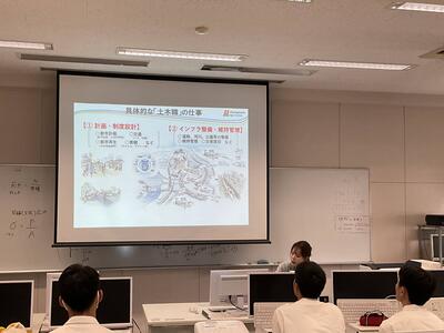 熊本市役所から2名に来校していただき、土木職の業務や採用についての説明をしていただきました。土木職として地元のインフラに貢献できるということで、地元に密着した仕事ができることがやりがいにつながっていると話を聞くことできました。