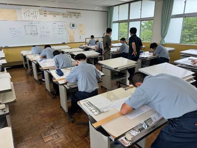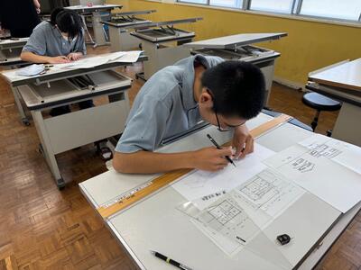 建築科2年生の実習は、製図・木工・測量の3つの班にわかれて行います。