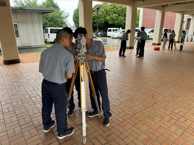 測量:セオドライト測量で、据え付け方と水平角などの角度測定を学びます。