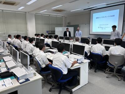 3年生課題研究の時間に、『地域コンサルタントの役割』という題で地元の建設コンサルタントの水野建設コンサルタントから3名のOBの方から講義を受けることができました。