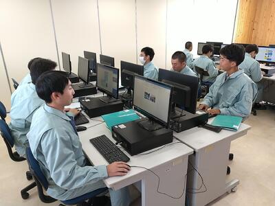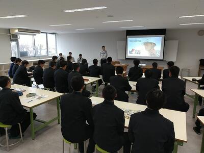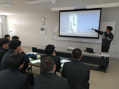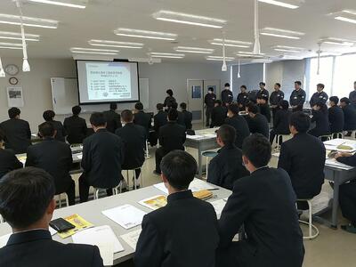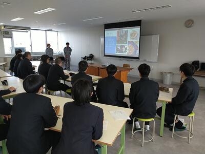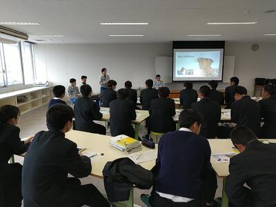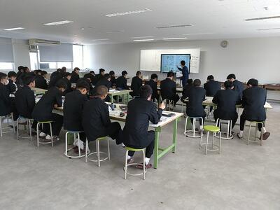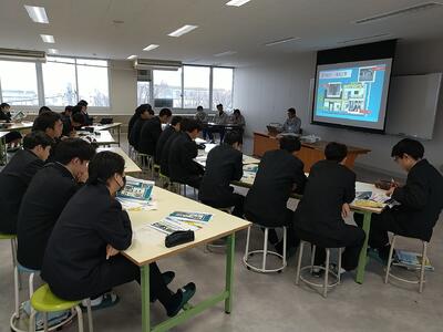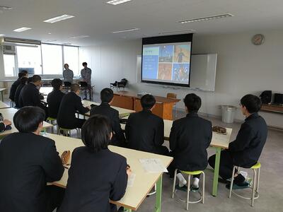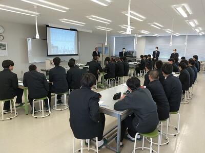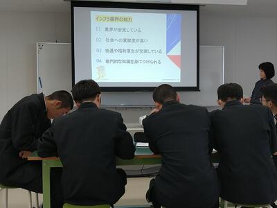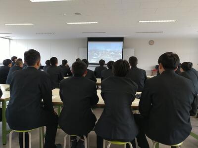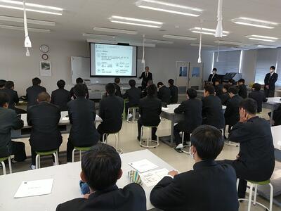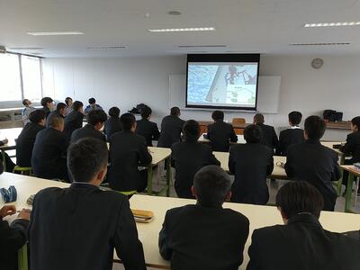 ㈱九電送配サービスから、グループ長と卒業生の3人が来校されました。企業概要や業務の説明を丁寧にしていただき、皆真剣に話を聞いていました。先輩たちの研修中や職場の雰囲気が伝わる動画を見せてもらうなど、とても貴重な時間を過ごすことができました!