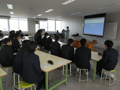 九電工㈱から、副所長と卒業生の3人が来校されました。企業概要や職種の説明を丁寧にしていただき、皆真剣に話を聞いていました。先輩たちからはどんな質問にも笑顔で答えてもらい、とても貴重な時間を過ごすことができました!