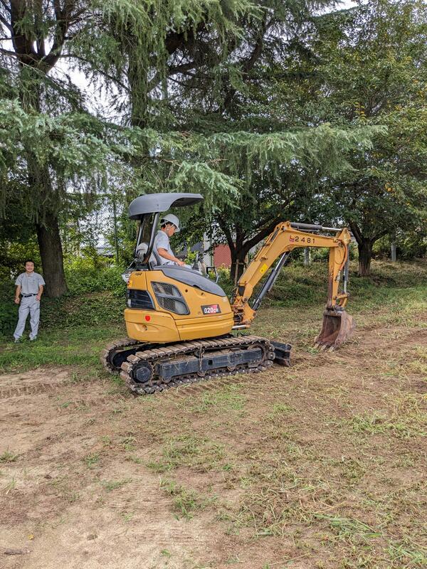 重機で掘削を行い、地中に管を埋設する実習を行いました。管に電気を流して圧着、水栓に繋げて水が流れるまでの一連作業を行いました。また、管の破損に対しての止水作業など水に濡れながらの作業だったため、楽しく実習を行うことができました。
