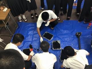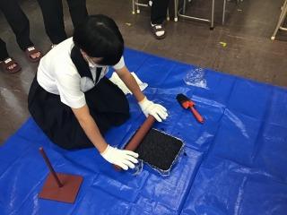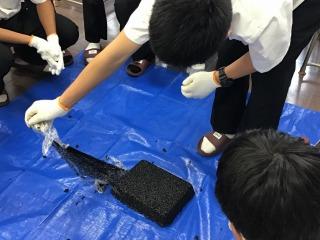 講義では、熊本地震時に施工業者が行った業務などを聞きました。また、室内実習ということで、簡易舗装を体験しました。