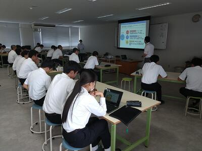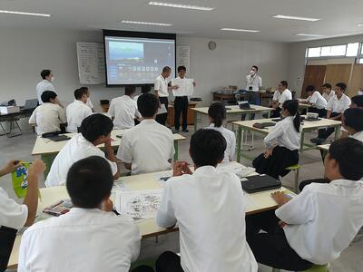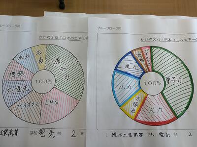 九州電力㈱熊本支店から講師がいらっしゃいました。日本のエネルギー事情や発電の仕組み、カーボンニュートラルへの取り組みなどの説明と、VRによる原子力発電所見学を実施していただきました。また、日本のエネルギーの未来について話し合い、発表しました。