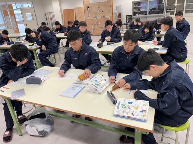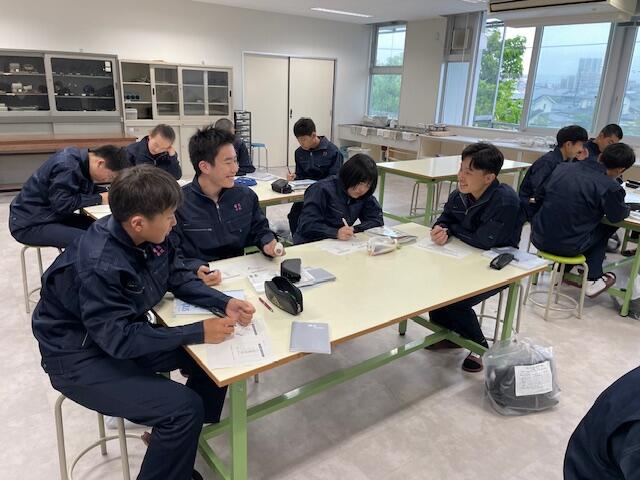 工業高校では実験・実習を通して、工業の幅広い分野にわたる基礎的な知識と技術を体験的に学ぶことができます。体験的な活動を通して、工業の意義や安全作業の心構え、課題解決能力を養います。今日は初日、実習服の確認とレポートの書き方、安全教育(KYT:危険予知トレーニング)などを行いました!3年間の高校生活を快適に過ごすためには、⚡すぐすれば、すぐすむ⚡です!
