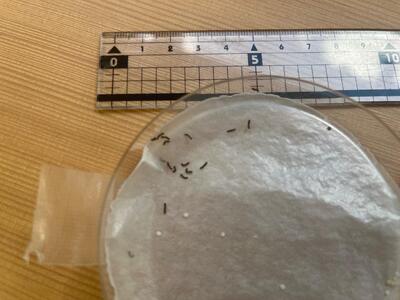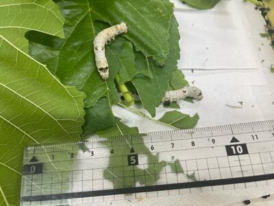 少し大きい蚕は、5齢ほどに育ったもので、あと一週間ほどで繭づくりを始めるそうです。