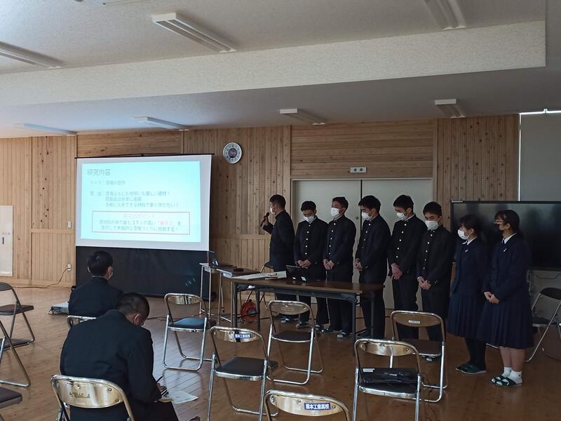 1月20日(木)に新実習棟1号館の工業基礎実習室で三年生が二年生に向けて今年1年間取り組んだ研究の成果を発表しました。(以下、発表順)