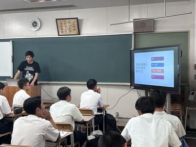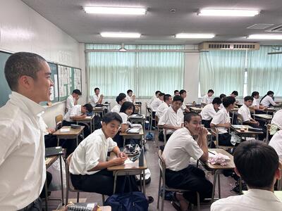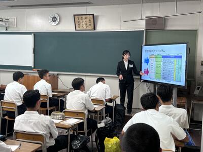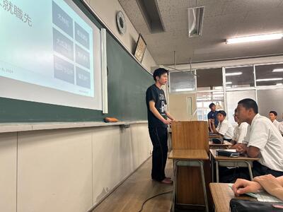 土木系学科のある大学進学されている卒業生を迎え、進学関係卒業生講話を行いました。高校時の生活、受験勉強、入試情報、大学での生活などこれから進路選択をする1・2年生対象に分かりやすく説明してくださいました。