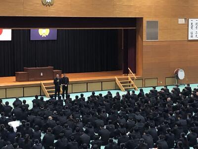 より良いあいさつができる熊工を目指して、生徒たちの中からあいさつ隊長が選出され、全校生徒に呼びかけました。