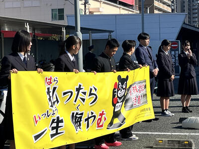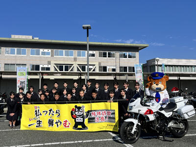 本日、熊本県熊本東警察署で行われた「電話で『お金』詐欺」被害防止啓発横断幕のお披露目式に、テキスタイルデザイン科2年生全員で参加しました!