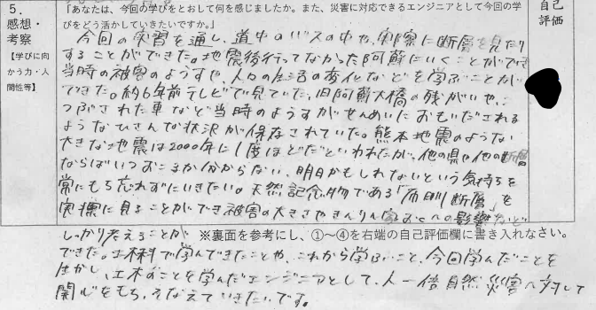南阿蘇や益城町を中心に大きな被害が出た活断層を見学、地震のメカニズム、これからの防災・減災を学びました。研究されている熊本大学の先生方に帯同していただき、多くのことを学ぶことが出来ました。