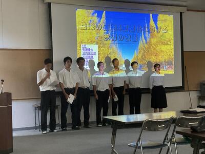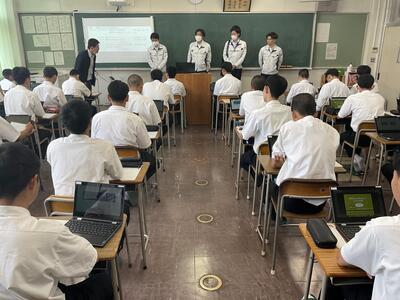 土木科3年生公務員希望者12名に対して、熊本県庁・国土交通省より、それぞれの事業内容や携わる工事に関する役割、福利厚生などについて、本校OBを含めて説明会を行うことができた。これから、志望官庁を決定するタイミングで詳しい説明を聞き、進路選択の上で貴重な経験となった。