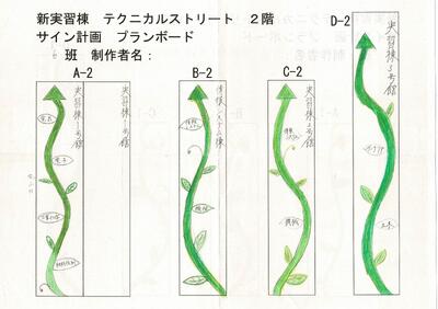このテクニカルストリートには、夏休み前に、インテリア科2年生がサイン計画の学習を行い、8班の各デザイン案を発表し、投票で決まったものが掲示され、案内板として使われています。