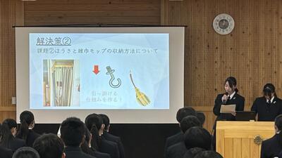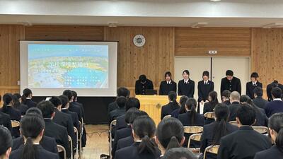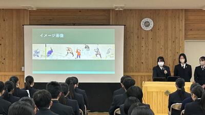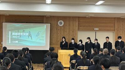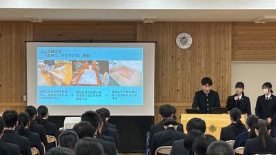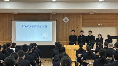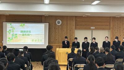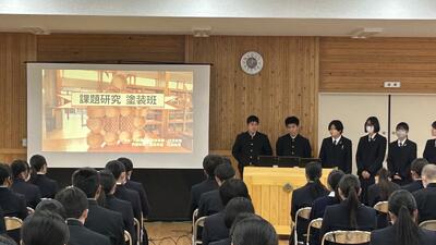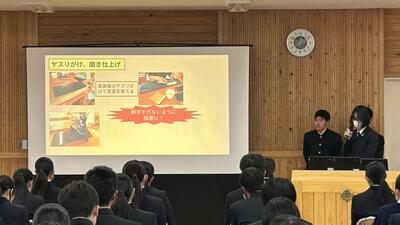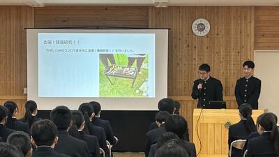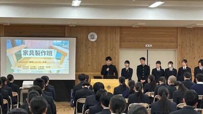 1、2年生に対して3年生が約1年間活動してきた課題研究について発表しました。以下の6つの班に分かれて活動を行ってきましたが、各班の取り組み内容や感想・反省を交えた発表を行ってくれました。課題研究としての授業はまだ、残りがありますので、完成できていない「もの」の完成を目指したり、具体的な内容を「作品展」で紹介できるような準備などをしていきます。