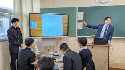 <教育実習生の研究授業>同じ時間、1年生の教室では、本校の卒業生である教育実習生による研究授業が行われました。自作のアプリケーションを活用し、進数計算を探索クイズ形式で展開するなど、生徒の知的好奇心を引き出す工夫が光る、素晴らしい授業となりました。