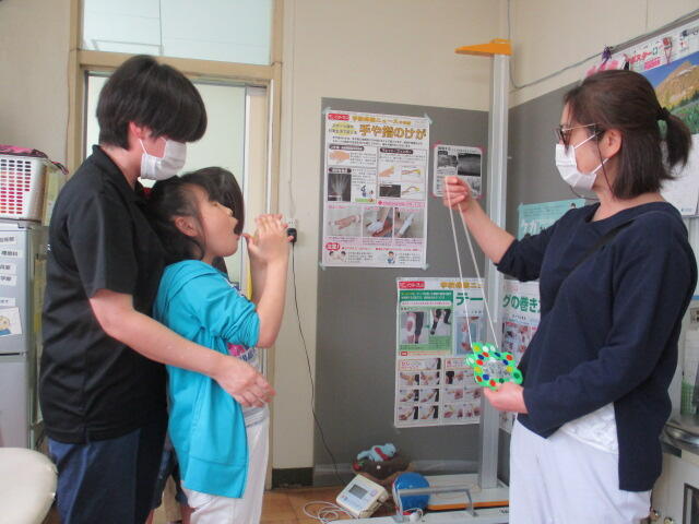 寂しく遊んでいたら、中学部のお兄さんが来てくれて一緒に遊ぶことができました。得意の体操やダンス、立っちをいつもより頑張って披露しました。優しく名前を呼んで貰ってご機嫌でした。