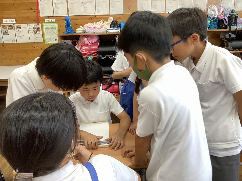 国語の時間には、グループで話し合い活動をしました。児童が普段使っている点字盤に、交流先の児童は興味津々です。