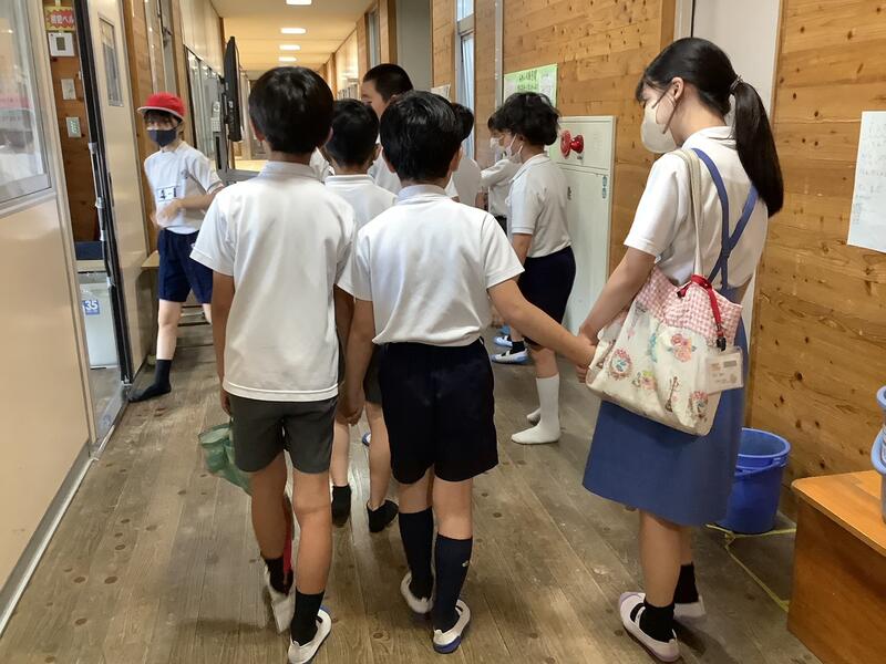 図書室へ移動するときには、友達が誘導してくれました。これまで何回も交流しているので、「手すりはここだよ。」と自然と階段の手すりの場所も教えてくれます。