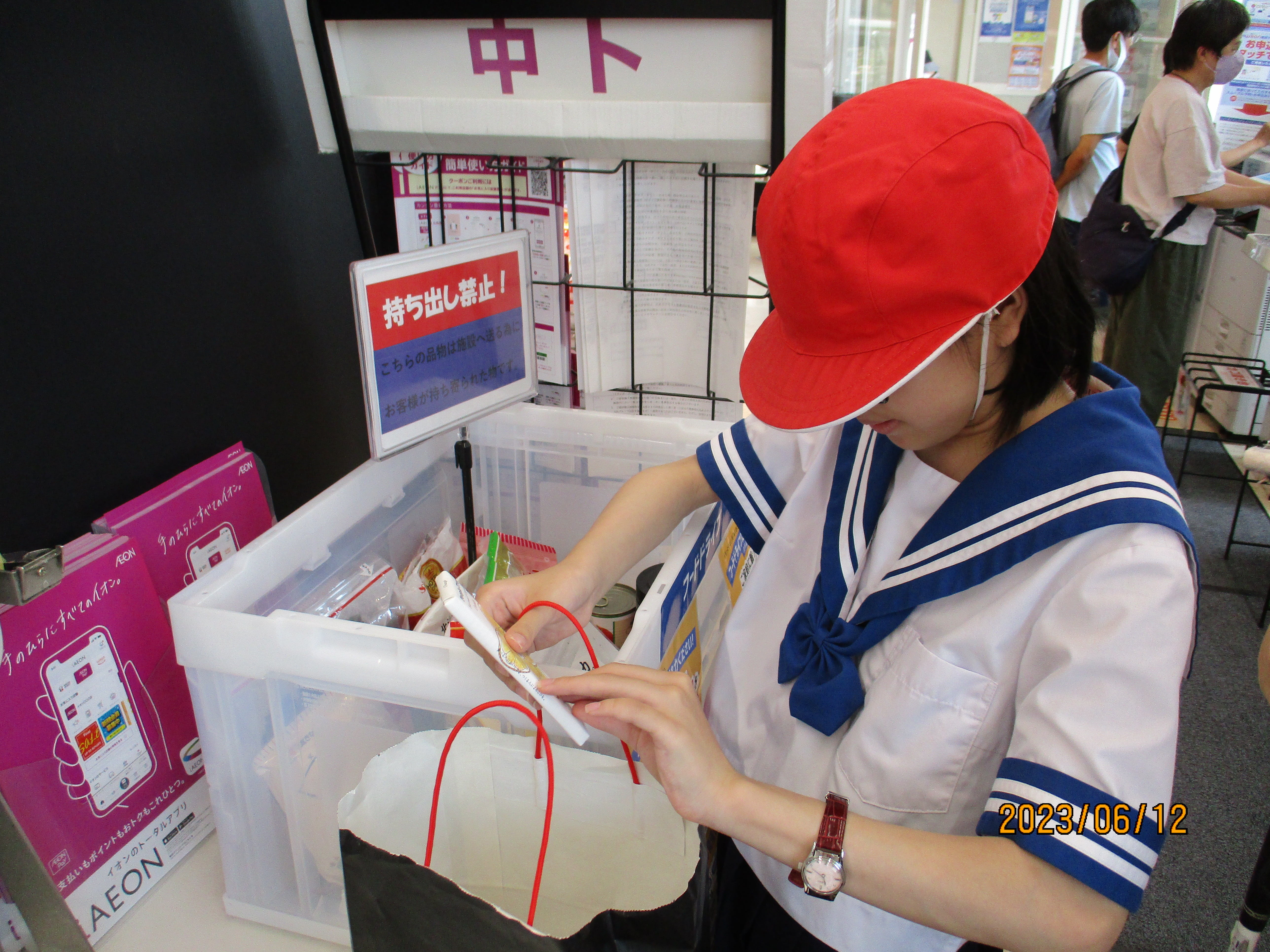 食に関する学習を行う中で、近隣の店舗で、フードドライブという食品の寄付活動があっていることを知り、各家庭から食品を持ち寄り、参加してきました。