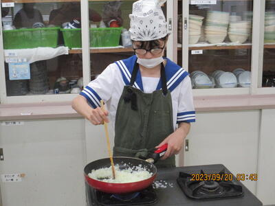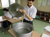 中学部、高等部では、厨房で使用する道具に触れ、その大きさや重さ、家庭にある道具との違い等について体験をしました。その中で、『食缶を直接火にかけて調理をしている』と誤解していた生徒がおり、新たな発見と驚く場面がみられ、興味・関心をもって体験する姿がありました。普段、何気なく食べている給食について、感謝の気持ちや理解を深めるよい機会となりました。