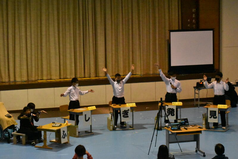 中学部では、「おでかけ!ふしぎ発見!」と題して、総合的な学習の時間で学習した内容をクイズ番組仕立てで発表しました。総合的な学習の時間では、公共交通機関の利用について学び、生徒たちが校外学習を実際に企画して行くという学習を行っています。ICカードの有用性、バスの時間や行き先の調べ方、車椅子でのバスの利用方法など、校外学習の企画を通じて学んだことを生徒たちがクイズにして、観客(中学部の保護者や関係者)を巻き込んでの発表を行いました。校外学習先などで撮影したVTRや生徒たちの演技も交え、実際のテレビ番組のように仕上がりました。練習では、「この台詞はもっと変えた方がいい」、「テロップは立てられた方がいいね」など、生徒たちが自ら意見やアイデアを出し、ステージ発表を作り上げてきました。当日は、練習を含めてこれまでで一番素晴らしい発表をすることができ、生徒たちは達成感と自信を感じている様子が見られました。