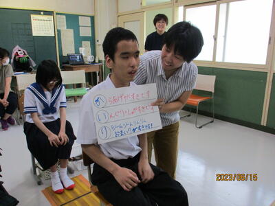 中学部では、定期的に3学年合同での道徳の授業を行っています。本校中学部は、1学級の人数が少ないので、こういった集団での授業は生徒たちにとって毎回刺激的な学びの場となっています。