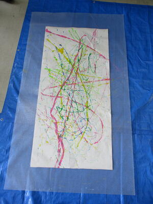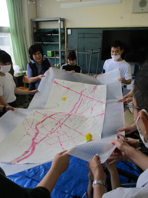 手紙を貼る台紙は、普通科全員で大きな広用紙を持ち、絵の具をつけたボールを転がす等して、制作しました。