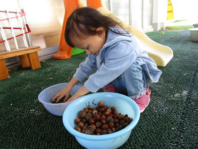 毎朝CDで歌を聞いています。お気に入りの歌が流れると、いつも一瞬動きを止めて「あっ!トトロだ!」と確認しているような様子が見られます。他にも、好きな歌が増えています。二人で歌って楽しんでいます。砂場遊びをしました。少しずつ砂の感触が分かったようです。今週は、「砂の上に下りてみよう」が目標でした。挑戦!で、お山の上に先生と一緒にお座りしてみました。お顔は必死でしたが、泣くこともなく、暫く、歌を歌って過ごしました。