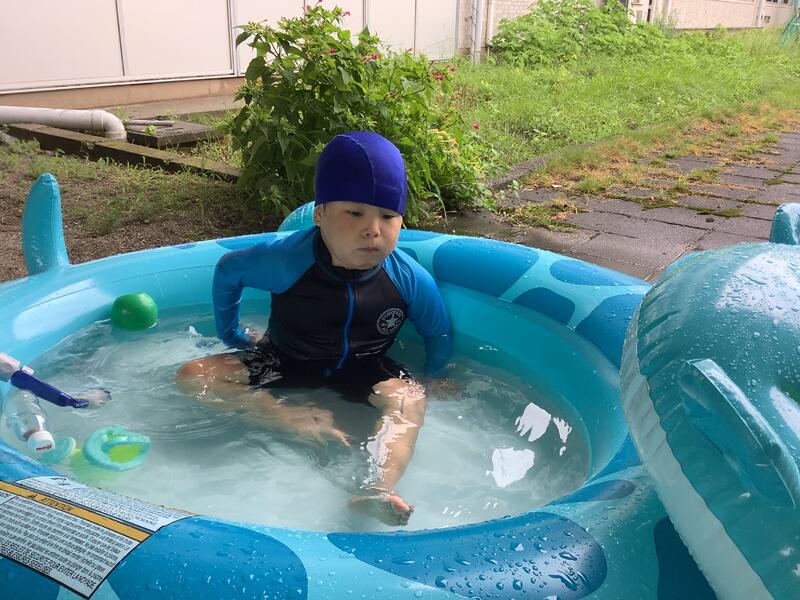 台風がきて雨が多い週でしたが、雨がやむと、セミの賑やかな鳴き声も聞こえ夏の到来を感じます。天気のいい日は、大好きな水遊びを楽しみました。手と足を使って大きなプールを縦断することができました!