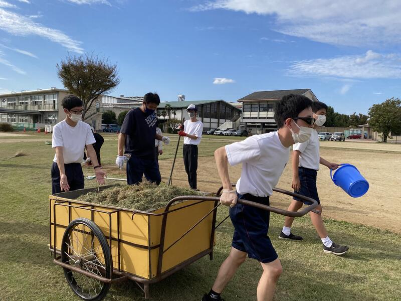体育祭まであと2週間となりました。日々、体育祭へ向けて練習や準備に取り組んでいます。今日はLHRの時間に、グラウンドの除草作業を行いました。最初は指示された場所で作業をしていましたが、次第に自分からまだ終わってない場所を見つけて行動する姿が見られました。暑い中の作業でしたが、終わった時にはみんな笑顔に!!体育祭を成功させるための大切な時間になりました。