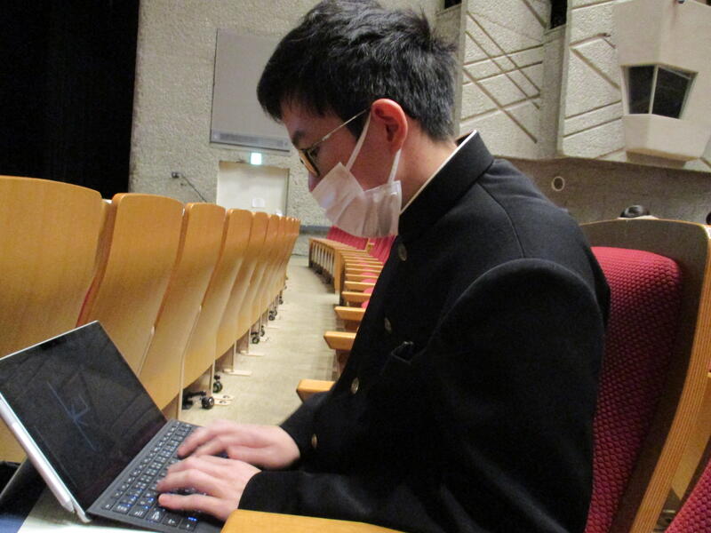 今年度は、会長1名、副会長2名の定員に対し、会長に2年女子生徒1名、副会長に1年男子生徒2名の計3名の立候補がありました。そこで今回は、過半数の信任を得たら当選となる「信任投票」となりました。 また、2名の生徒がリモートでの参加という、生徒会選挙始まって以来の開催となりました。