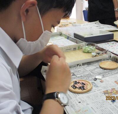 2日目は朝から自分のおにぎりを握り、午前中はトランポリン体験、午後からはタイルクラフト「コースター作り」に挑戦しました。