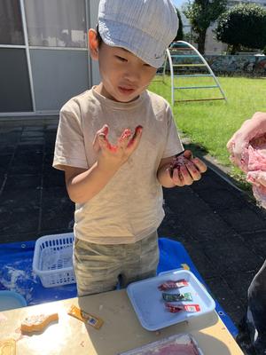 先週の水曜日に引き続き、テラスで小麦粉遊びをしました。今週は粉をカップにぎゅっぎゅっと入れて型抜きをしたり、ケーキを作ったりしました。その後は水を少しずつ入れて粉の変化を楽しみながらお団子やカメさんを作ったり…。粉がふわふわから少しずつベタベタ、べちょべちょになって、しっかりこねるとスライムみたいな感触になったり、柔らかい耳たぶみたいな感触になったり…水の量で変化する粉の様々な感触を楽しみました。