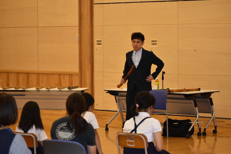 小・中・高普通科合同で、本校OBの尺八奏者「安田知博様」を迎えて。尺八のワークショップを体験しました。