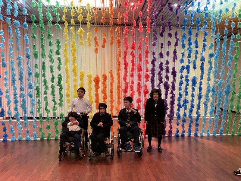 初めに特別に準備していただいた触ってもよい作品の「本読み童子」や「いやしぶた」を丁寧に触って鑑賞したり、常設展示のベット型作品に寝転んだり、木のボールプールに入ってリラックスしたりしました。次に、期間限定イベント「ライフ2」の探検では、「Orihime」ロボットと会話をしたり、簡単な操作をしてみたりしました。秋田の方が、遠隔操作をされていて、盲学校の生徒が「秋田は何色?」と聞くと、「うーん、灰色かな?熊本は?」「みどり」などという会話が弾みました。他にもカラフルな絵画作品を見学して、最後には、レインボーマンの部屋に到着。虹色のテープを張り巡らせた綺麗な空間で虹のふさふさに触ったり、テープの束を裂いて結びつけたりし、美術品を作り上げる体験もできました。