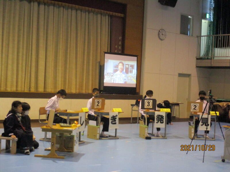 中学部では、「おでかけ!ふしぎ発見!」と題して、総合的な学習の時間で学習した内容をクイズ番組仕立てで発表しました。総合的な学習の時間では、公共交通機関の利用について学び、生徒たちが校外学習を実際に企画して行くという学習を行っています。ICカードの有用性、バスの時間や行き先の調べ方、車椅子でのバスの利用方法など、校外学習の企画を通じて学んだことを生徒たちがクイズにして、観客(中学部の保護者や関係者)を巻き込んでの発表を行いました。校外学習先などで撮影したVTRや生徒たちの演技も交え、実際のテレビ番組のように仕上がりました。練習では、「この台詞はもっと変えた方がいい」、「テロップは立てられた方がいいね」など、生徒たちが自ら意見やアイデアを出し、ステージ発表を作り上げてきました。当日は、練習を含めてこれまでで一番素晴らしい発表をすることができ、生徒たちは達成感と自信を感じている様子が見られました。