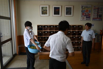 5月26日(金)午後、2Bクラスのホームルームで、おとなりの第二高校を訪問させていただき、梅ちぎりを体験しました。