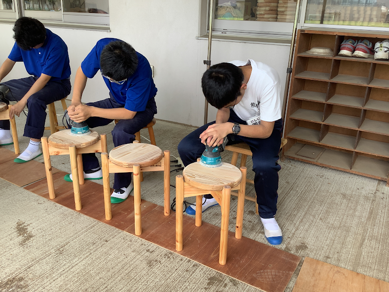 高等部普通科重複障がい学級の1,2年生4人は、6月21日(水)から毎週水曜日の午前中、熊本県立熊本はばたき高等支援学校の1年生木工班との作業学習を共同で行う交流をしています。今回は、2回目で、少し緊張感が取れ、磨きやダボ切りなど作業内容の異なる班に分かれて、はばたきの生徒さんに混ざって作業をしてきました。難しい作業もできるようになって嬉しかったという感想も