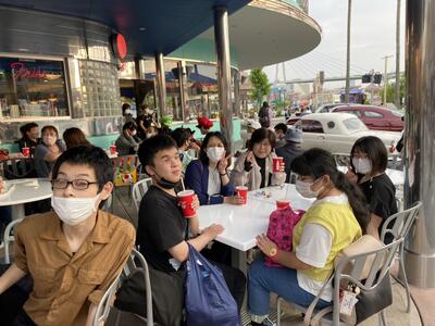 夕食。いつもと違う雰囲気で、仲間と一緒に食事。