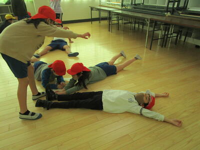 体育の表現運動では、友達と一緒に『ピザ』ができるまでの様子を身体で表現しました。