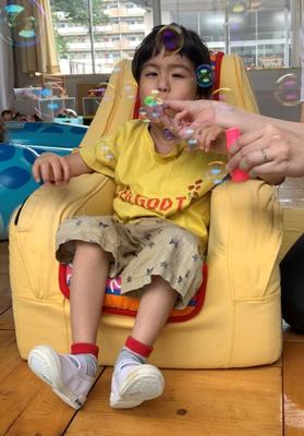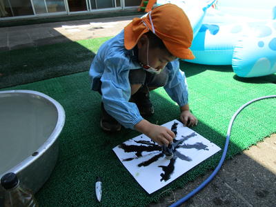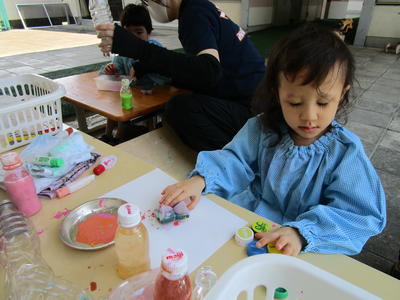 絵の具を使って色々な方法でにじみ絵を描きました。筆に色水を含ませて、水で濡らした画用紙に色水を落としてお花みたいな模様ができたり・・・ペットボトルに絵の具と水を入れてシェイク♪シェイク♪ふたに開けた小さな穴から色水がぽたぽた出てきて、とっても優しい色の素敵な模様ができたり・・・スポンジに含んだ色水をスタンプみたいにポン♪ポン♪ポン♪スポンジのふわふわの感触を楽しんだり・・・世界に一つだけのにじみ絵ができました!