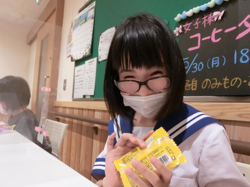 女子棟で行われたコーヒータイムでは、飲み物・お菓子持参で女子トークで盛り上がりました。後半はイントロクイズをしました。自分が知ってる曲の時は、しっかり手を挙げて答えていました。とても楽しい時間でした。
