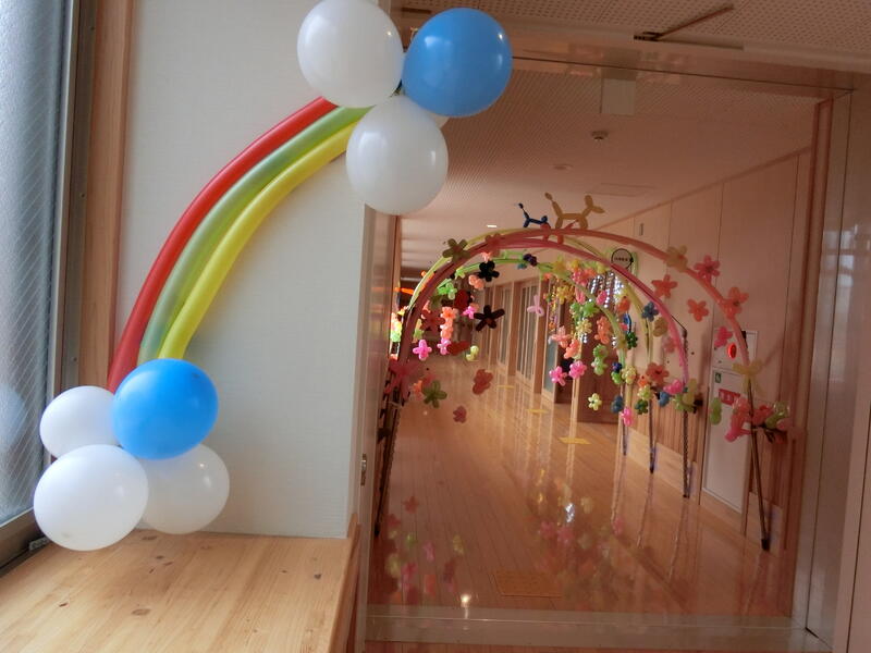 食堂から共同教室までの廊下には、職員手作りのバルーンアートでアーチを作りました。バルーンには鈴をつけて、アーチをくぐる際に音色を楽しめるよう工夫しました。ステージ装飾は、大きな桜の木を作りました。たくさんの桜の花には、卒業生のこれからが明るい未来でありますようにという願いを込めました。卒業生の皆さんも、とても喜んでいただきました☆