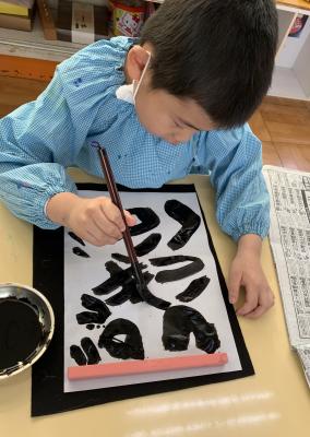 書き初めでは、「上から下によーいどん!」「左から右によーいどん!」「まるまるまる♪」と言いながら筆の運びの練習もばっちり!今年の目標や頑張りたいこと、好きなことを一人一人筆を使って書きました。
