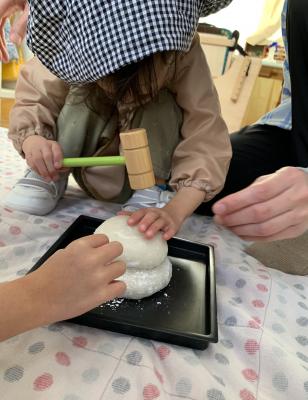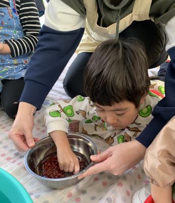 鏡開きでは、おもちをおしるこに入れてみんなで食べました。最初は固い小豆とおもちが火を通すと柔らかくなり、おいしいおしるこに変身!素材の変化を五感でじっくり味わいました。