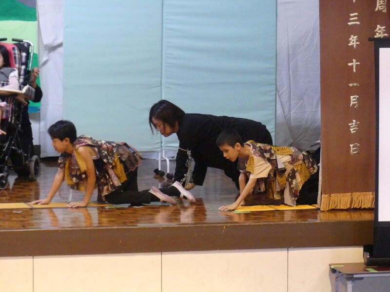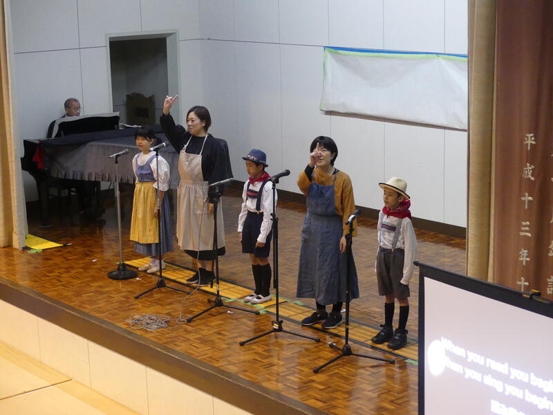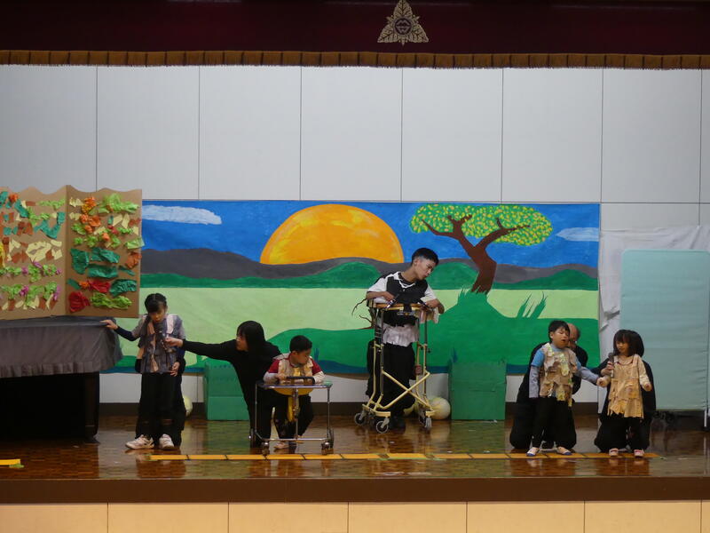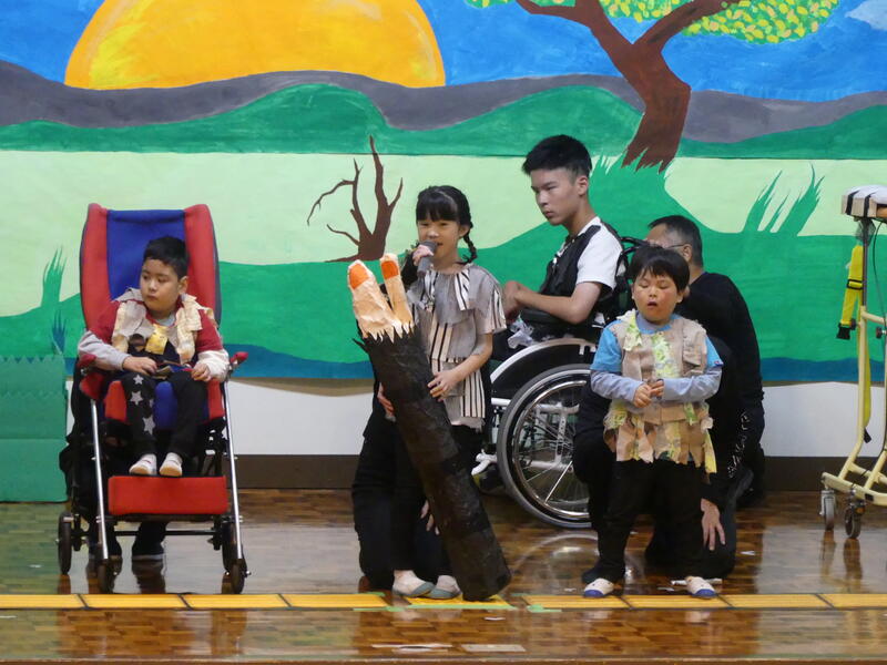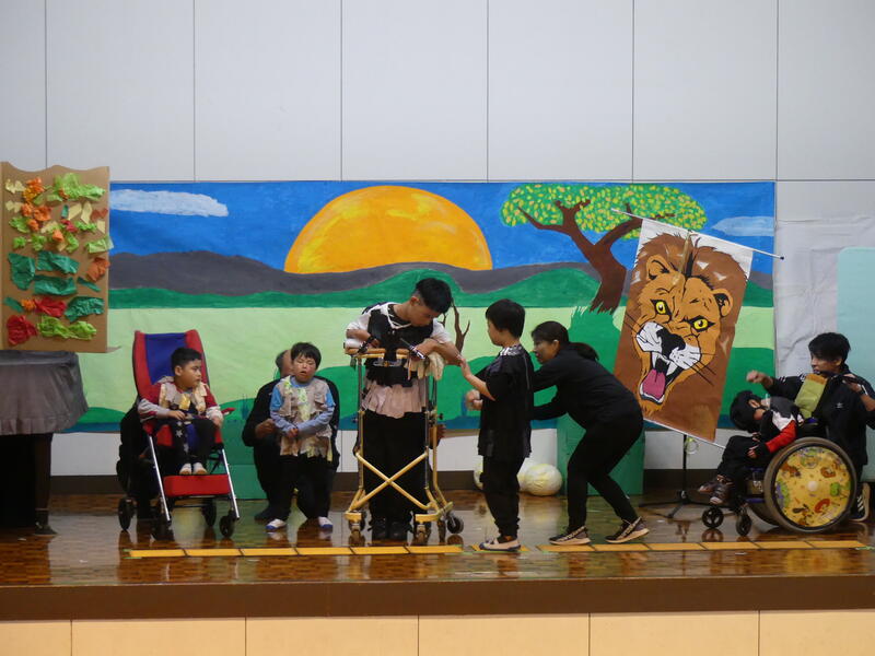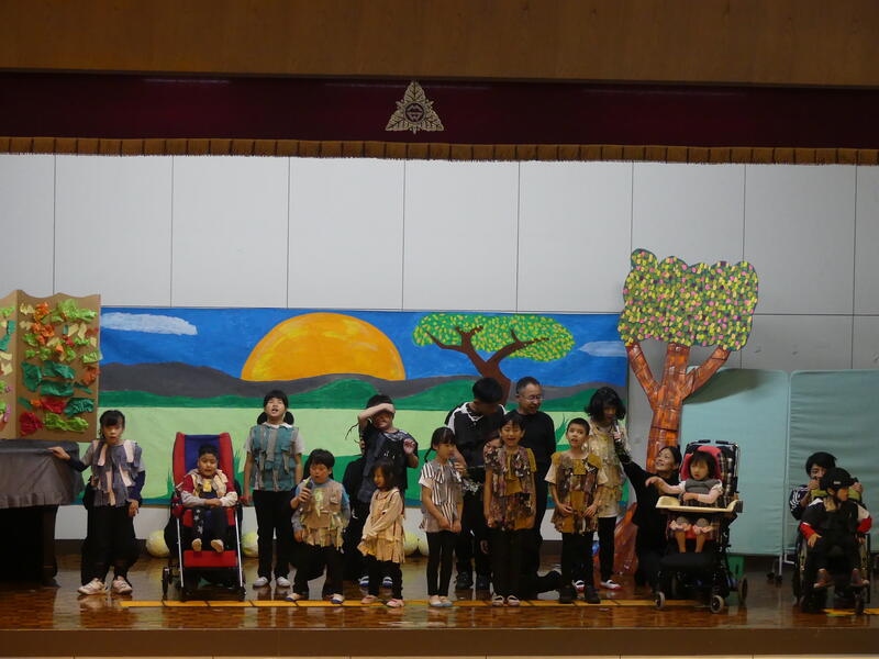 今年の文化祭、幼小学部の発表はオープニングアクトで歌やリコーダー演奏があり、次に劇「かたあしダチョウのエルフ」でした。クラスでの練習や全体練習を頑張り、本番は大成功でした。